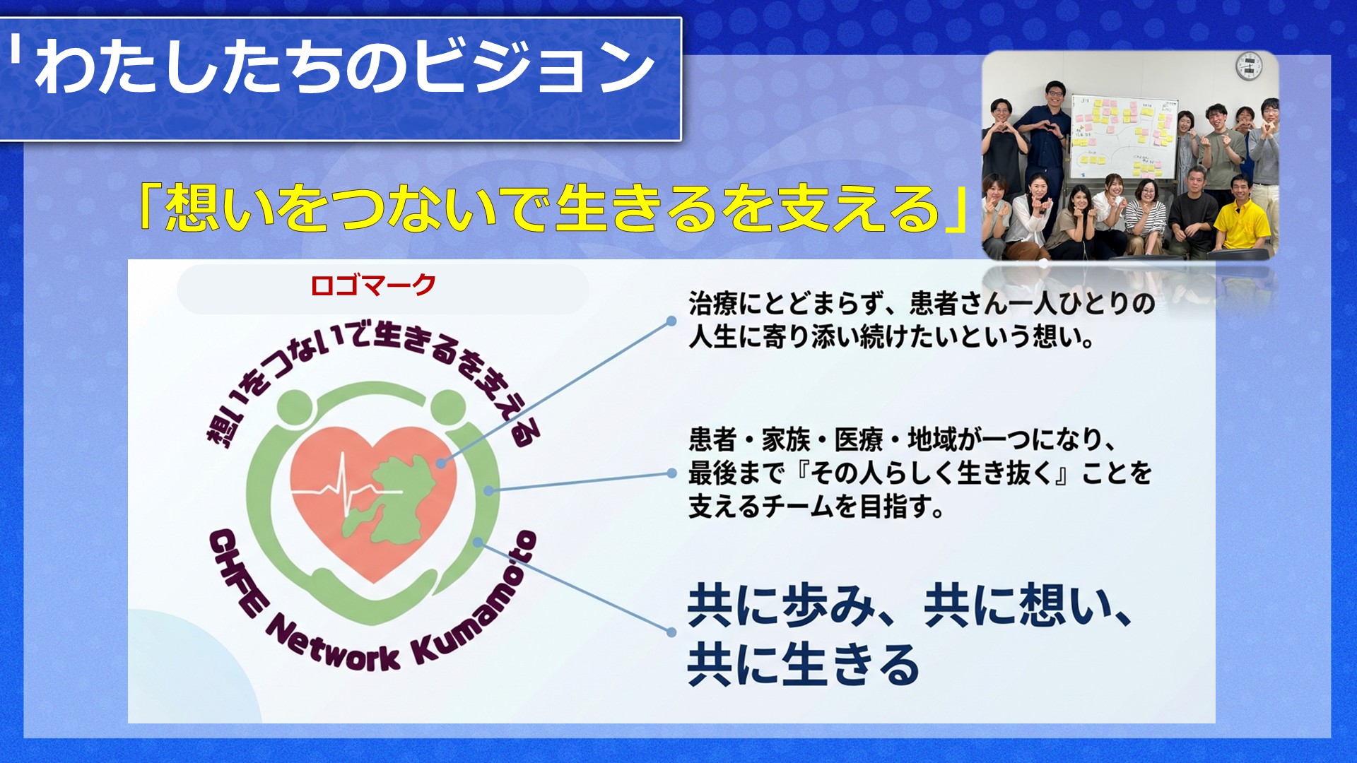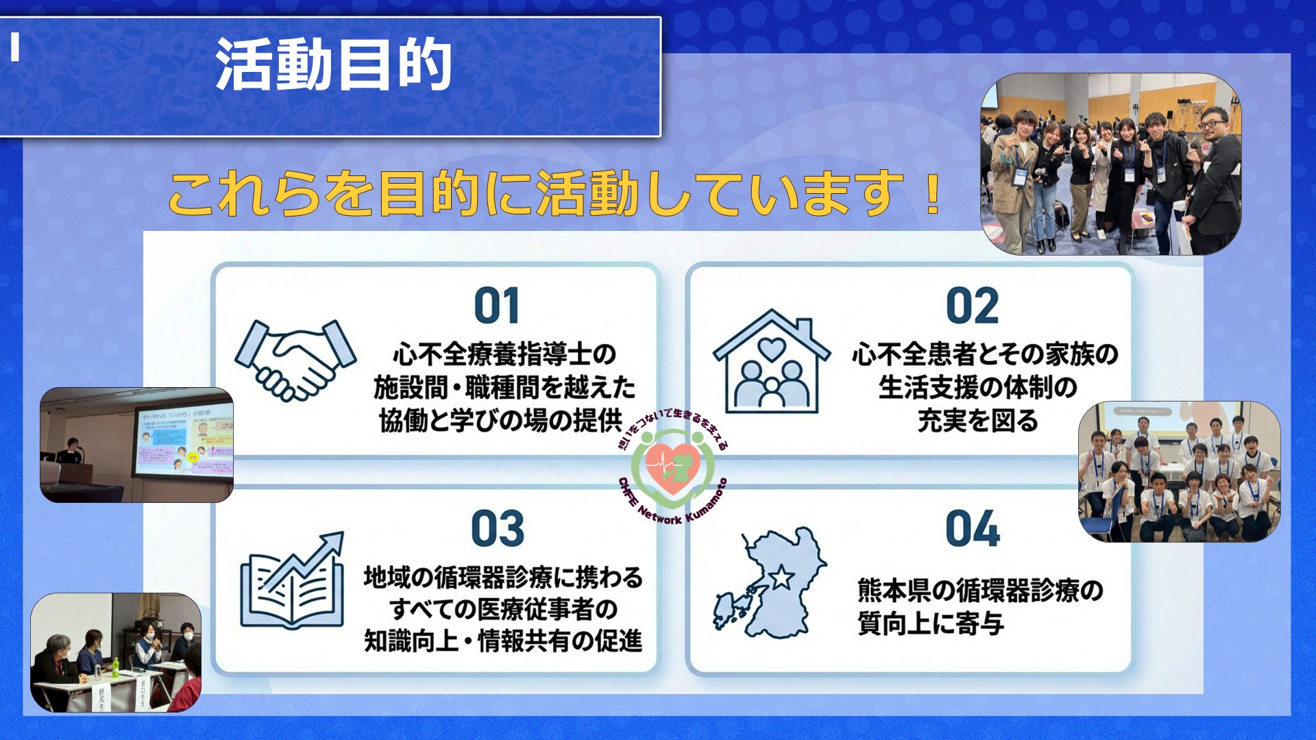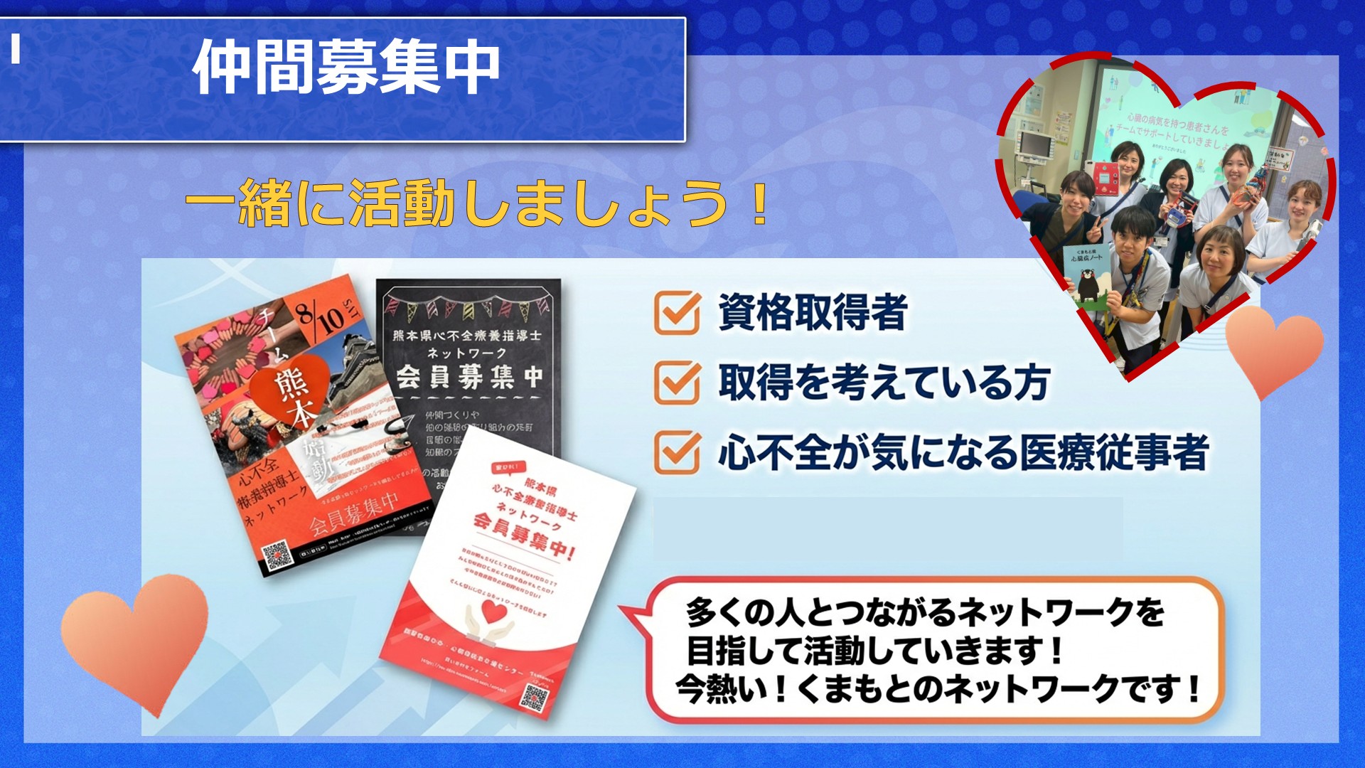「想いをつないで生きるを支える」をビジョンに熊本県で心不全ケアを広げる仲間と共に活動しています。心不全患者さんや家族の生活を支え、その人らしく生きるサポートができるように研修会や情報交換を行っています。