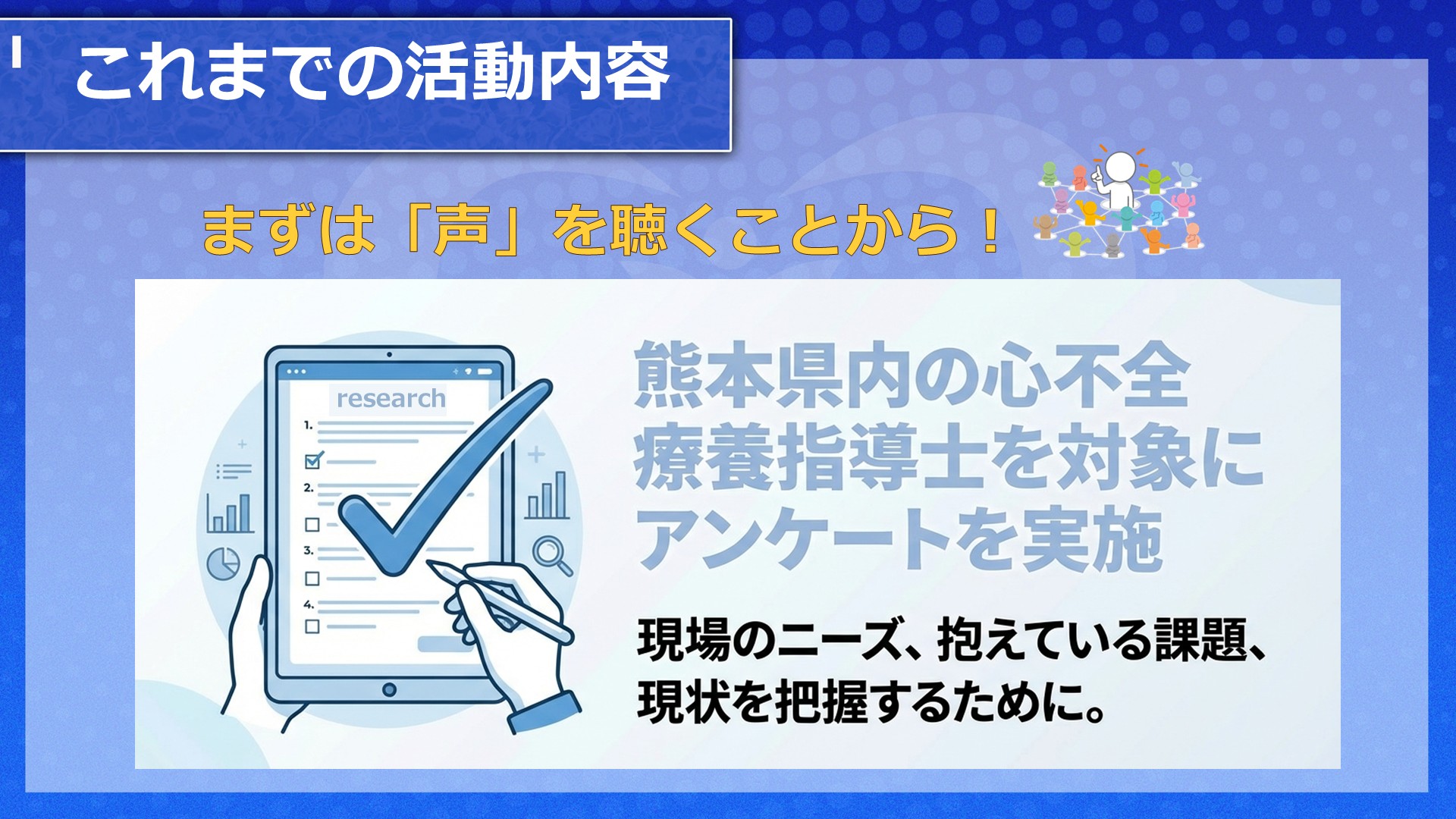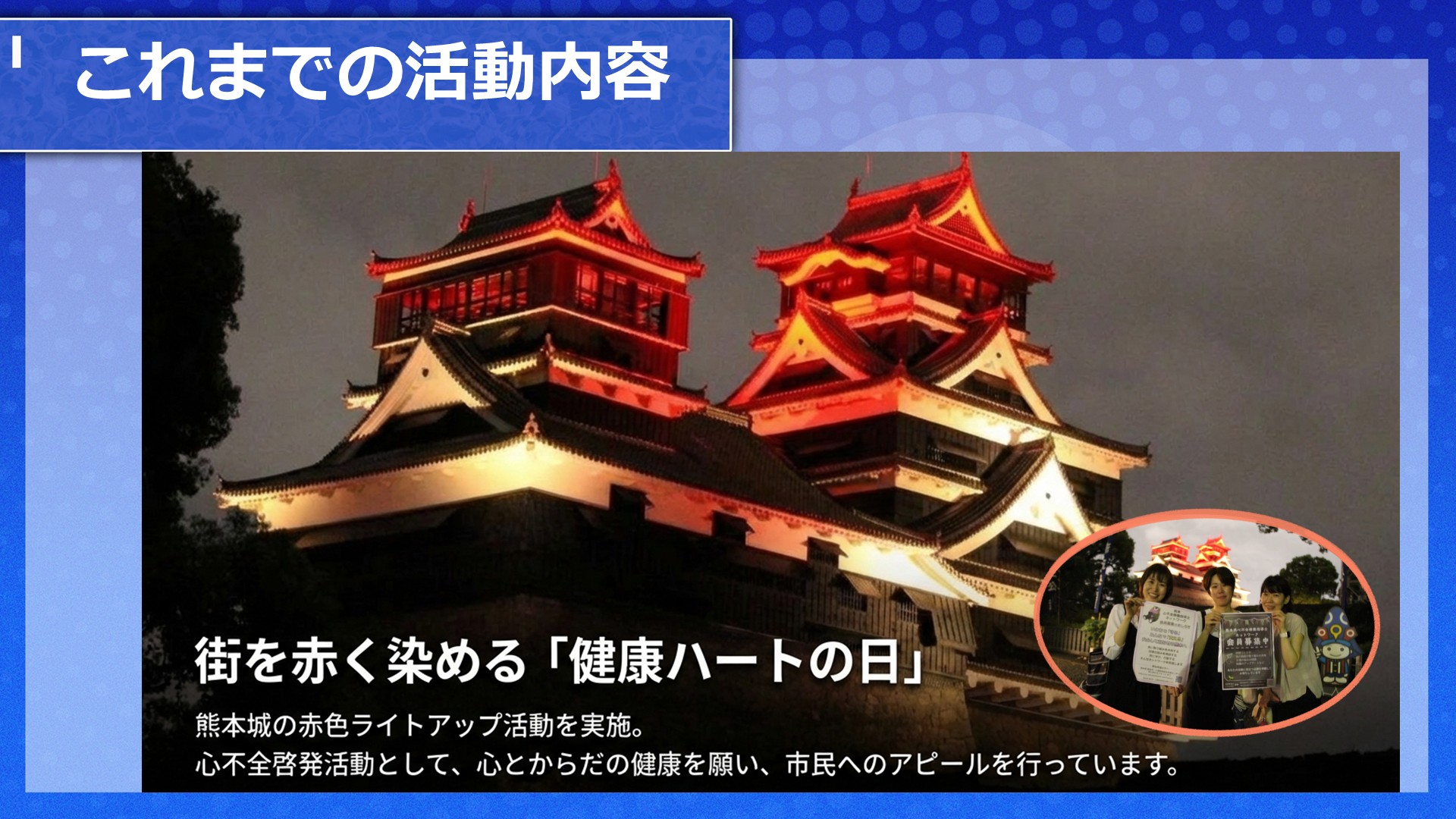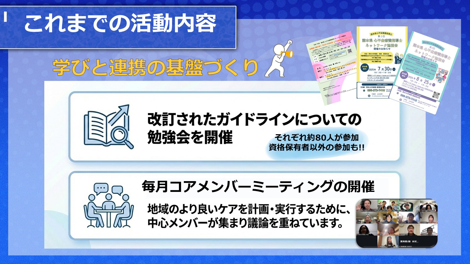 「想いをつないで生きるを支える」をビジョンに熊本県で心不全ケアを広げる仲間と共に活動しています。心不全患者さんや家族の生活を支え、その人らしく生きるサポートができるように研修会や情報交換を行っています。