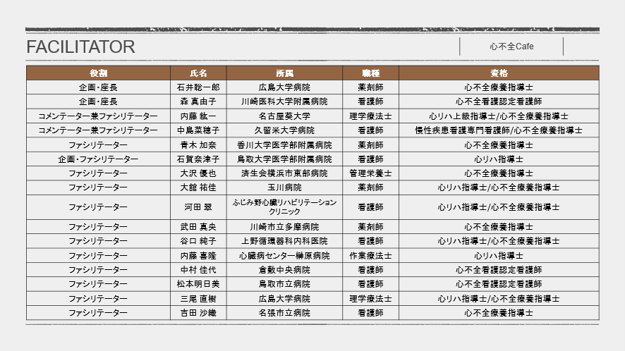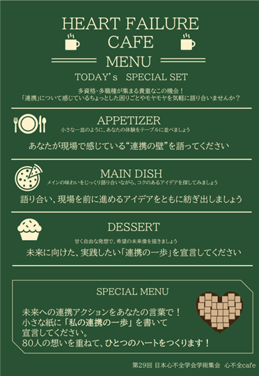 今回は、「十人十色の心不全」という学会テーマにふさわしく、心不全療養指導士をはじめ、心臓リハビリテーション指導士、慢性心不全看護/心不全看護認定看護師、今後資格取得を目指す方、そしてチーム医療に関心のあるすべての方を対象に、心不全cafeを開催しました。